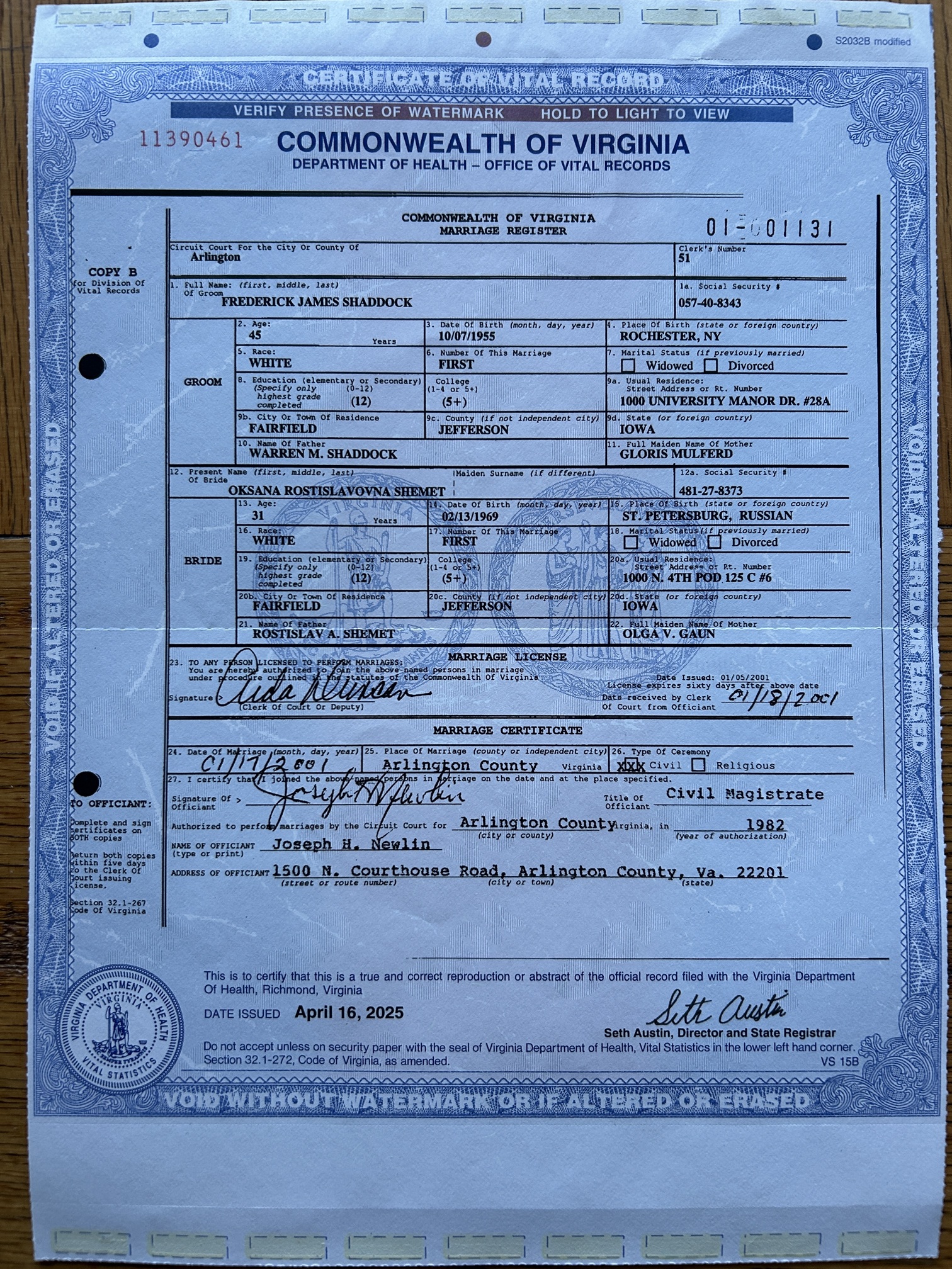 Justice Joseph H. Newlin performs the ceremony, and tries to pronounce Oksana Rastislavovna Shemet